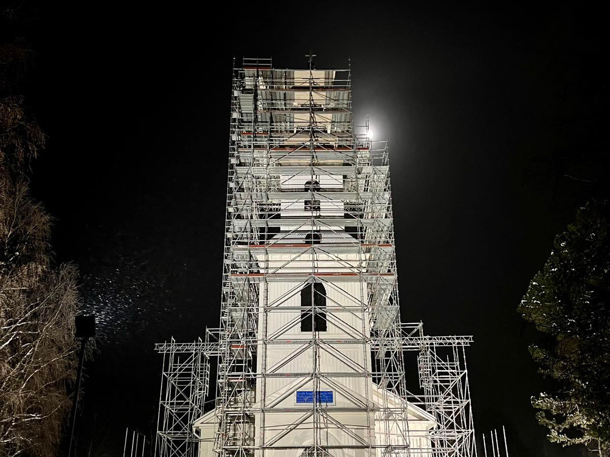 Gerüstmontage rund um eine Kirche