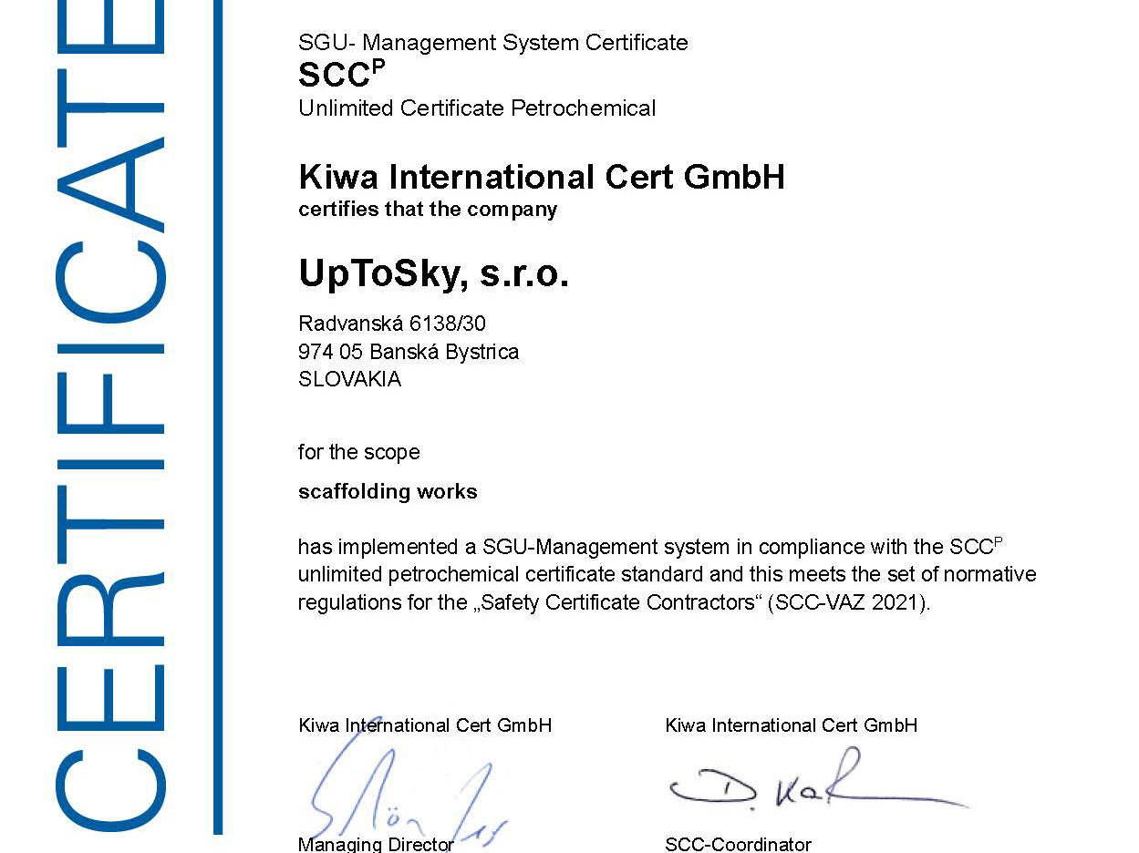 Scroll dowUnser Unternehmen besitzt das internationale SCC-P-Zertifikat (Safety Certificate Contractors – Petrochemical), das von Kiwa ausgestellt wurde. Dieses Zertifikat steht für einen hohen Standard in den Bereichen Sicherheit, Gesundheitsschutz und Umweltschutz, insbesondere im risikoreichen Umfeld der petrochemischen Industrie.SCC-P ist die höchste Zertifizierungsstufe im SCC-System und richtet sich an Unternehmen, die risikoreiche Tätigkeiten ausführen – wie z. B. Gerüstbau, Montage, Demontage, Wartung oder technische Installationen in Industrie- und Chemieanlagen.Der Erwerb dieses Zertifikats bestätigt unsere fachliche Kompetenz, unseren systematischen HSE-Ansatz sowie die vollständige Einhaltung aller geltenden gesetzlichen Anforderungen.Dank unserer SCC-P-Zertifizierung sind wir umfassend qualifiziert, Projekte unter anspruchsvollen industriellen Bedingungen sicher und professionell in der gesamten Europäischen Union durchzuführen.n to see more